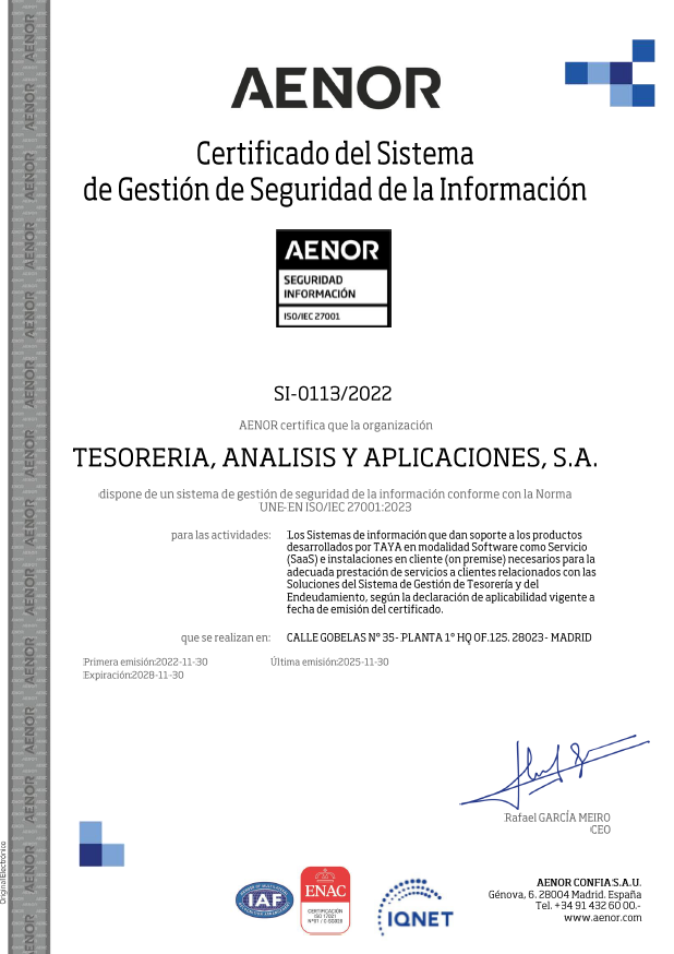 Una vez mas, TAyA ha superado la auditoria externa de AENOR, como evidencia de la conformidad de nuestro sistema de gestión de Seguridad de la Información con la norma UNE-EN ISO/IEC 27001:2017.