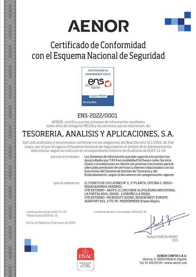Tras un periodo de evaluación interna y la implementación de las medidas de seguridad que prescribe la certificación en el Esquema Nacional de Seguridad (ENS), tanto en el marco organizativo como en el marco operacional, TAyA ha vuelto a superar la auditoria externa de AENOR, obteniendo el certificado ENS en la categoría MEDIA, como evidencia de la conformidad de nuestro sistema de gestión con la norma Real Decreto 311/2022 de 3 de mayo.